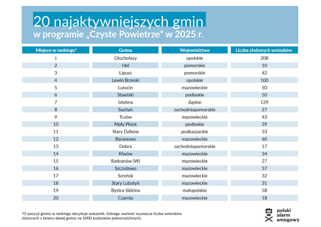 Gminy z województwa mazowieckiego zwyciężyły w rankingu aktywności w programie Czyste Powietrze za 2025 rok: w pierwszej setce znalazły się aż 23 gminy z tego województwa. Na podium znalazły się również województwa: podlaskie (14 gmin) oraz kujawsko-pomorskie (10 gmin). Zwycięzcą rankingu za rok 2025 została gmina Głuchołazy z woj. opolskiego, natomiast mazowiecka gmina Lutocin jest liderem rankingu obejmującym okres od początku jego funkcjonowania. W tej gminie prawie połowa właścicieli domów jednorodzinnych złożyła wniosek do programu.